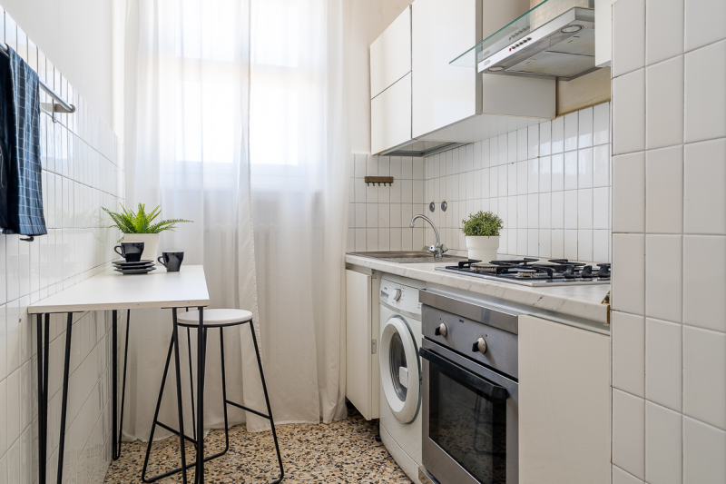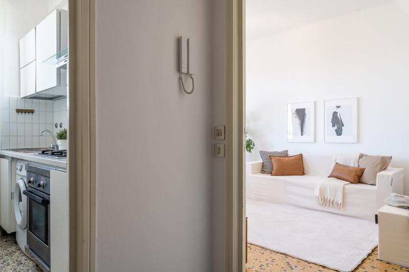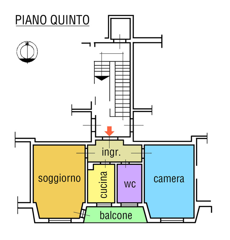 Sito al quinto ed ultimo piano servito da ascensore è così composto: ingresso, soggiorno, cucinotto separato da soggiorno (possibilità di realizzare ampio soggiorno con angolo cottura), camera letto matrimoniale, bagno e balcone; vano di cantina al piano interrato.