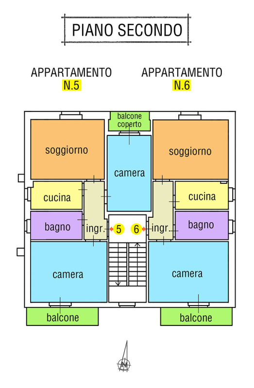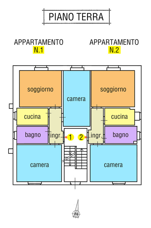 La casa è disposta su tre livelli, oltre al piano cantinato, e ospita due appartamenti per piano, per un totale di tre bilocali e tre trilocali (vedi planimetrie), così disposti: