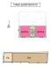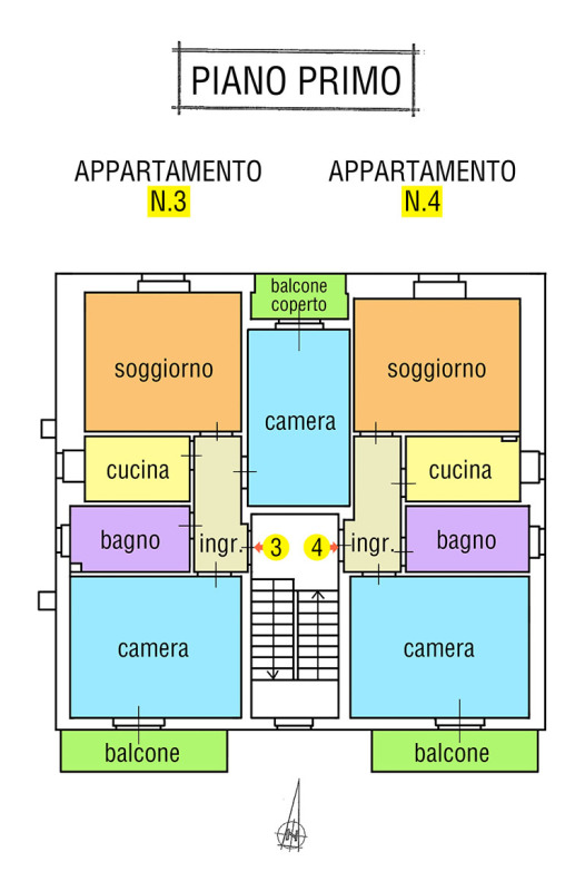 3 Bilocali (piano terra, 1° e 2°): ingresso, cucinotto, soggiorno, disimpegno, camera, bagno e balcone (al primo e secondo piano), per una superficie di circa 55 mq ciascuno.