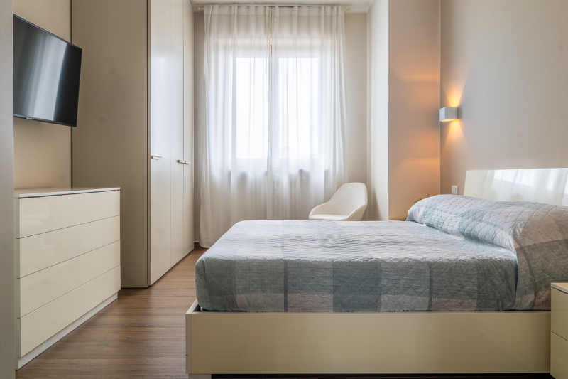 Sito al quarto piano servito da ascensore è così composto: ingresso, soggiorno con angolo cottura, camera letto matrimoniale, bagno, ripostiglio e balcone; vano di cantina al piano interrato; autorimessa al piano seminterrato adatta per una vettura utilitaria.