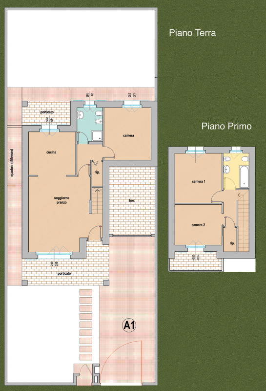 Composizione: cucina abitabile, soggiorno, bagno, camera letto, ripostiglio e porticati al piano terra; due camere, bagno e balcone al piano primo; il giardino accorpato e recintato con sovrastante box completa la proprietà.
